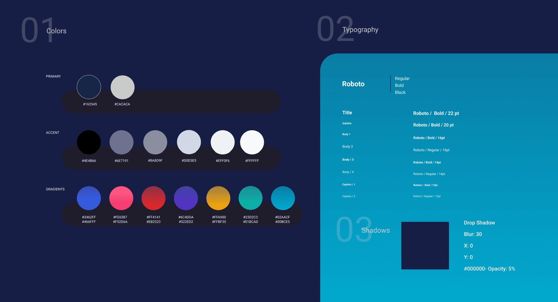 A color palette (navy, blue, green, red) designed for contrast, and emotional impact